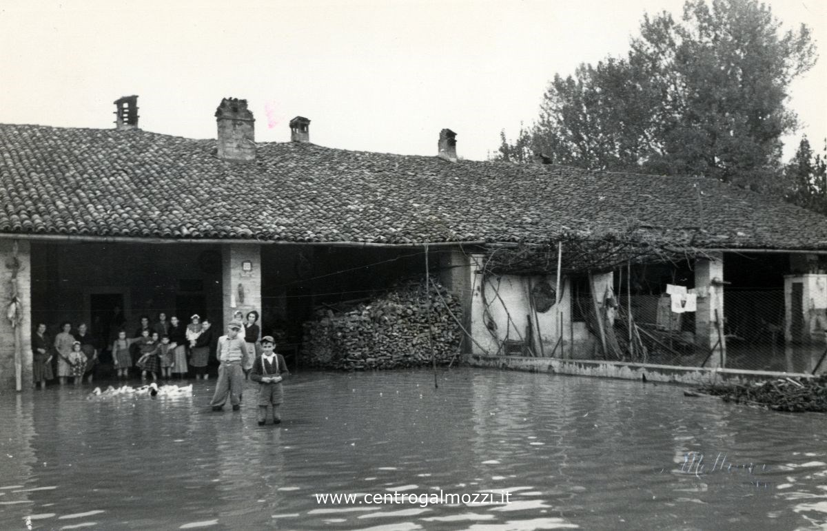 Le famiglie di una cascina nell'aia invasa dalle acque