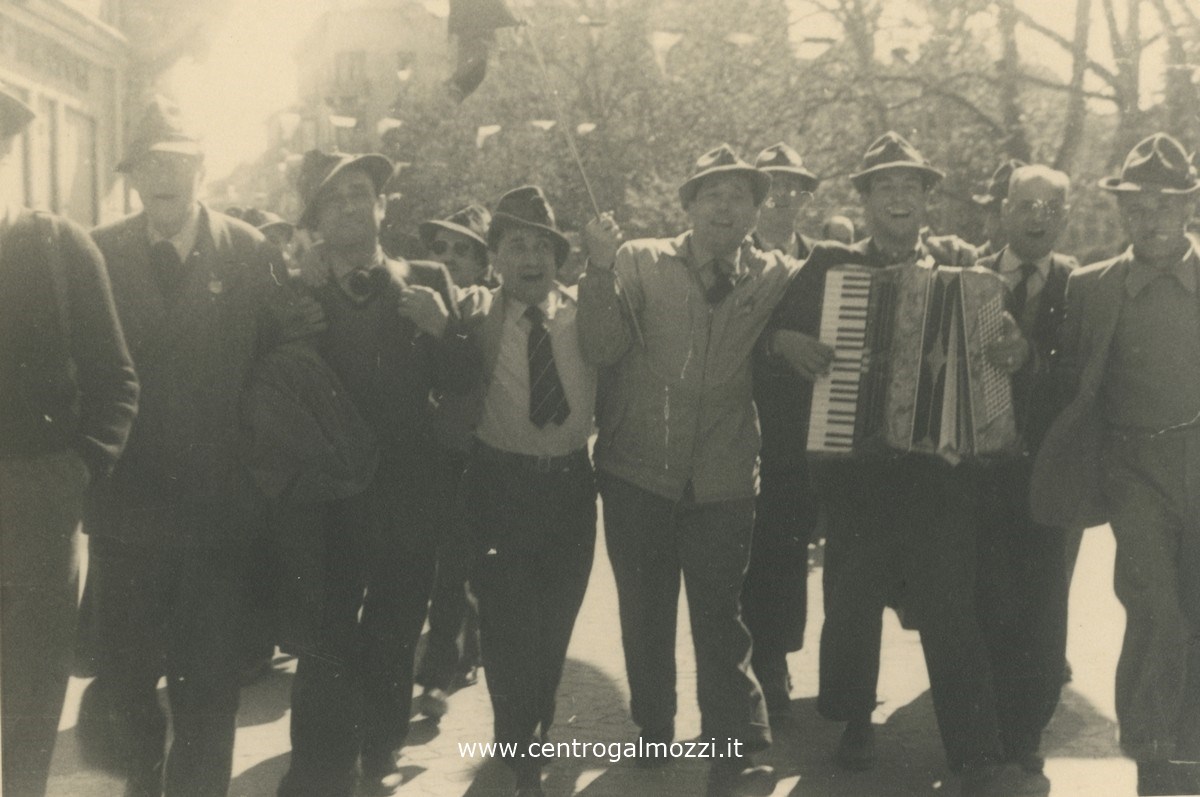 Gruppo di alpini cremaschi al raduno in Friuli Venezia Giulia che sfilano cantando accompagnati dalla fisarmonica. Si riconoscono Chiappa, Crotti, Sabbia