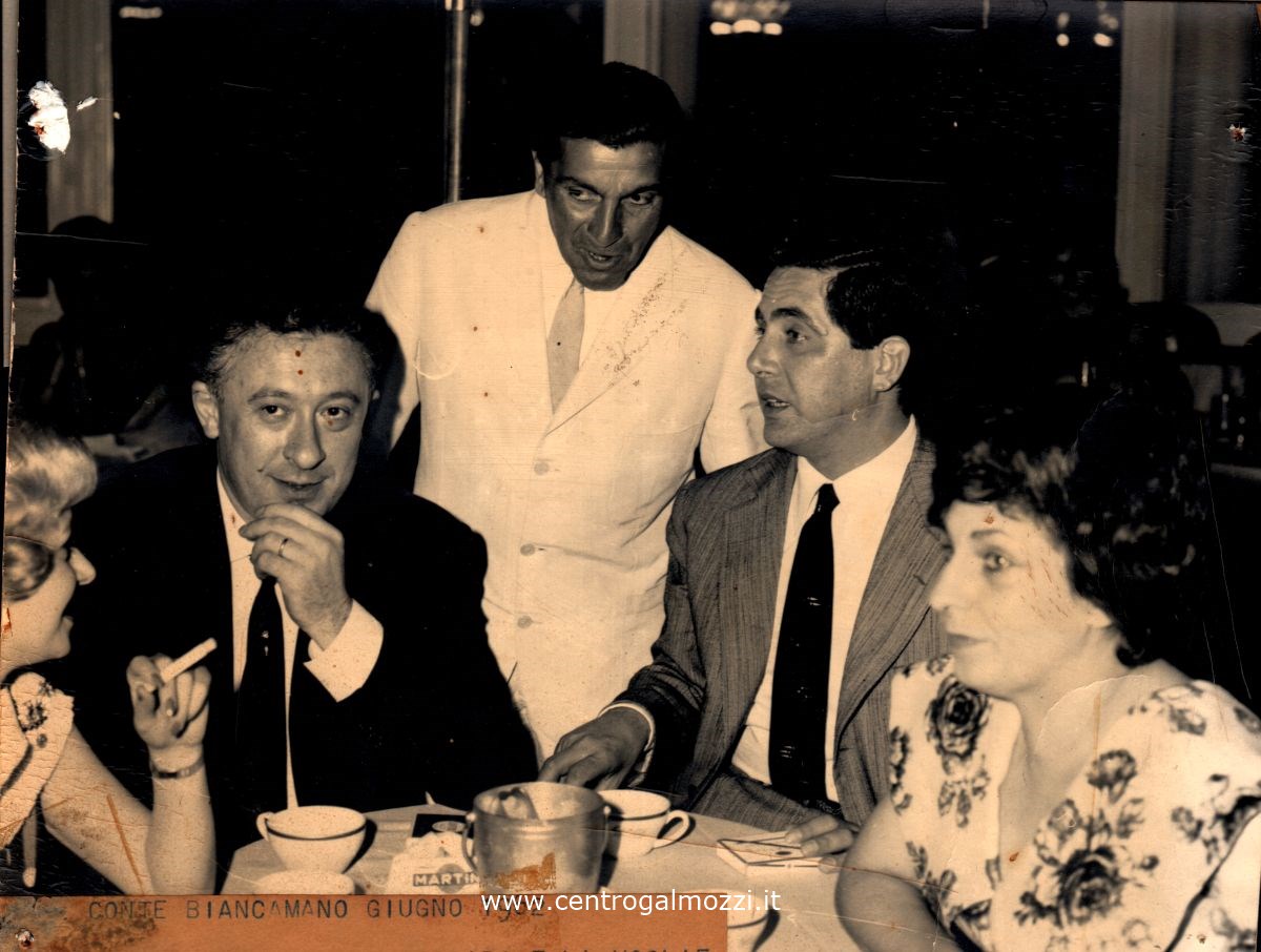 Ritratto di Corrado Mantoni e Luciana Guerra al tavolo con degli amici.