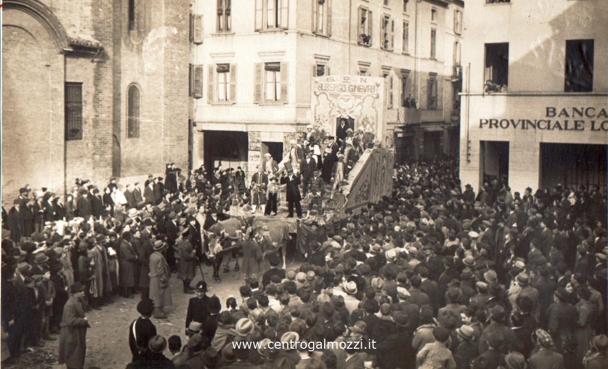 Carro carnevalesco che ironizza sul tema delle sanzioni di Ginevra contro la conquista italiana dell'Abissinia, fermo in Piazza Duomo al traino di una coppia di buoi