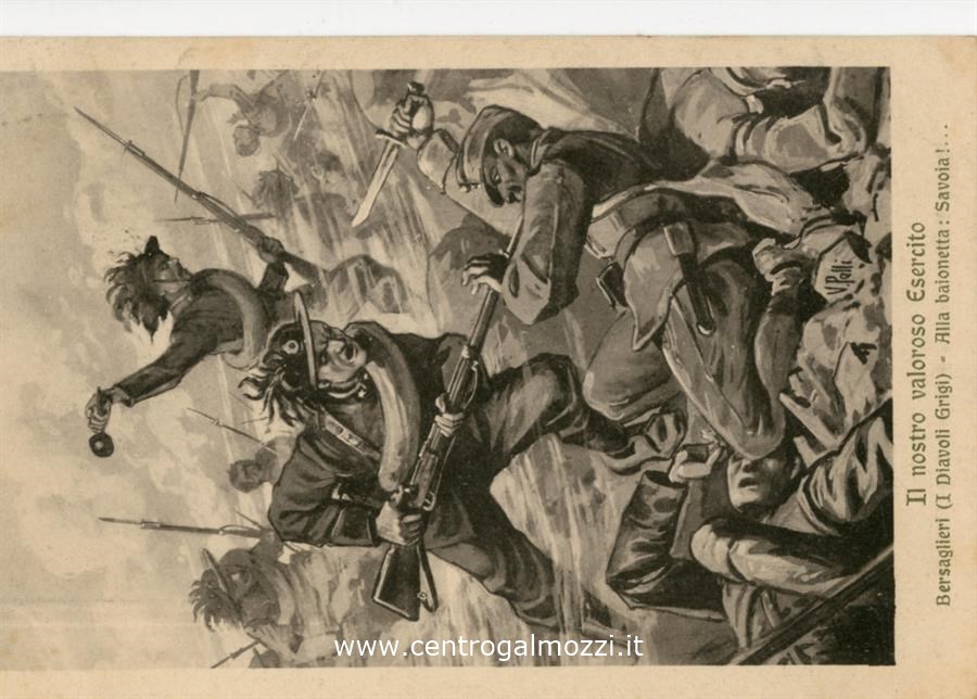 Sul fronte della cartolina si può osservare un reparto di bersaglieri impegnati in un'azione di guerra. In basso si può leggere un testo stampato: "Il nostro valoroso Esercito, Bersaglieri (I diavoli Grigi)- Alla baionetta: Savoia!".