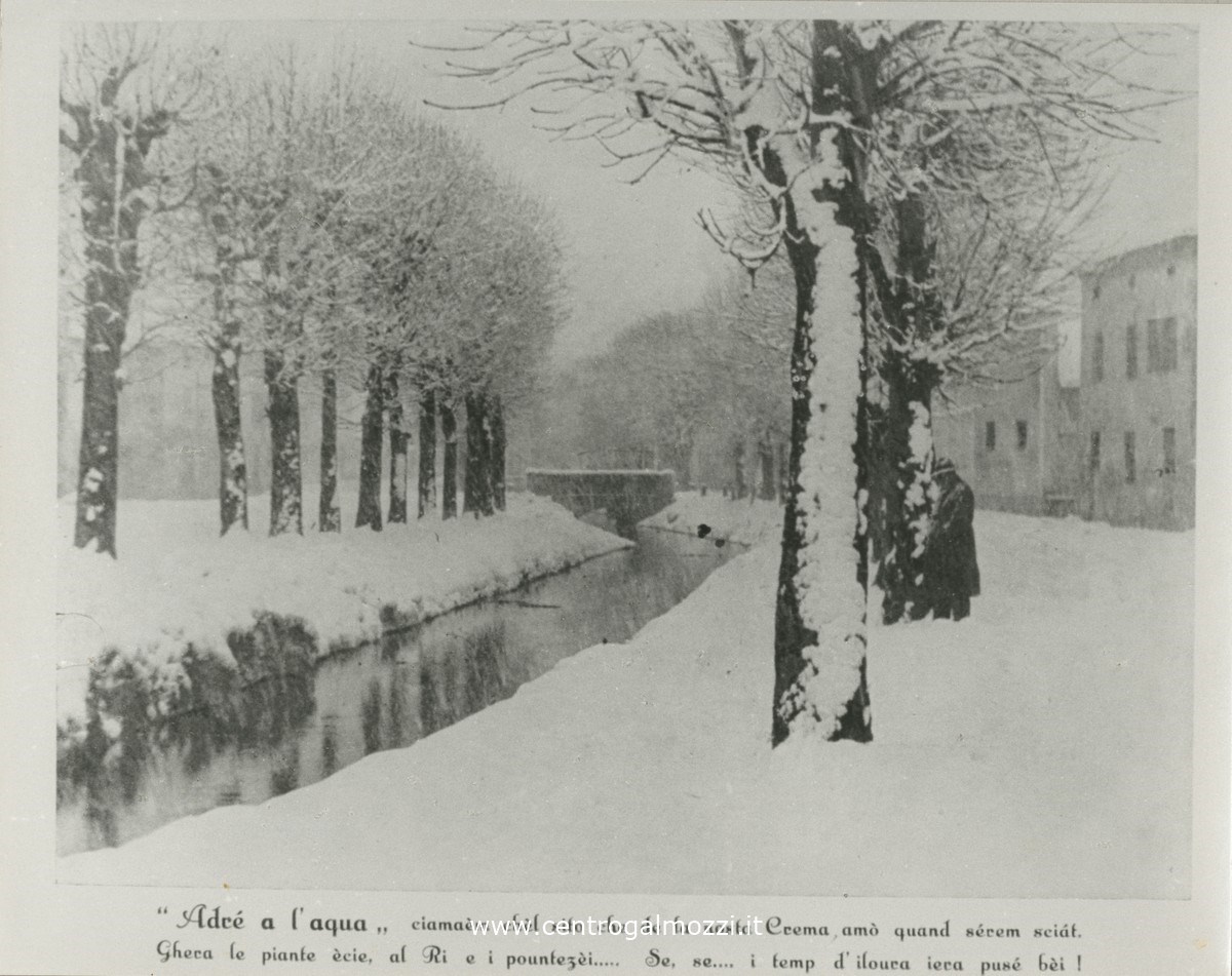 Veduta invernale della roggia Crema e del ponte per accedere in via Verdi (allora via Monte di Pietà) e al Deposito Cavalli Stalloni