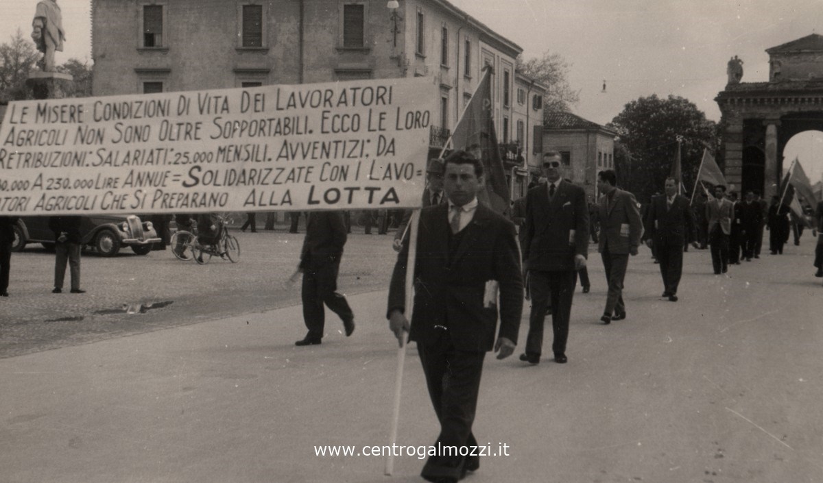 Dal 1947 al 1969 la festa del Primo Maggio vede due manifestazioni separate per le due confederazioni CGIL e CISL. Nella foto il corteo della Camera del lavoro Dietro lo striscione i lavoratori con le bandiere del PCI