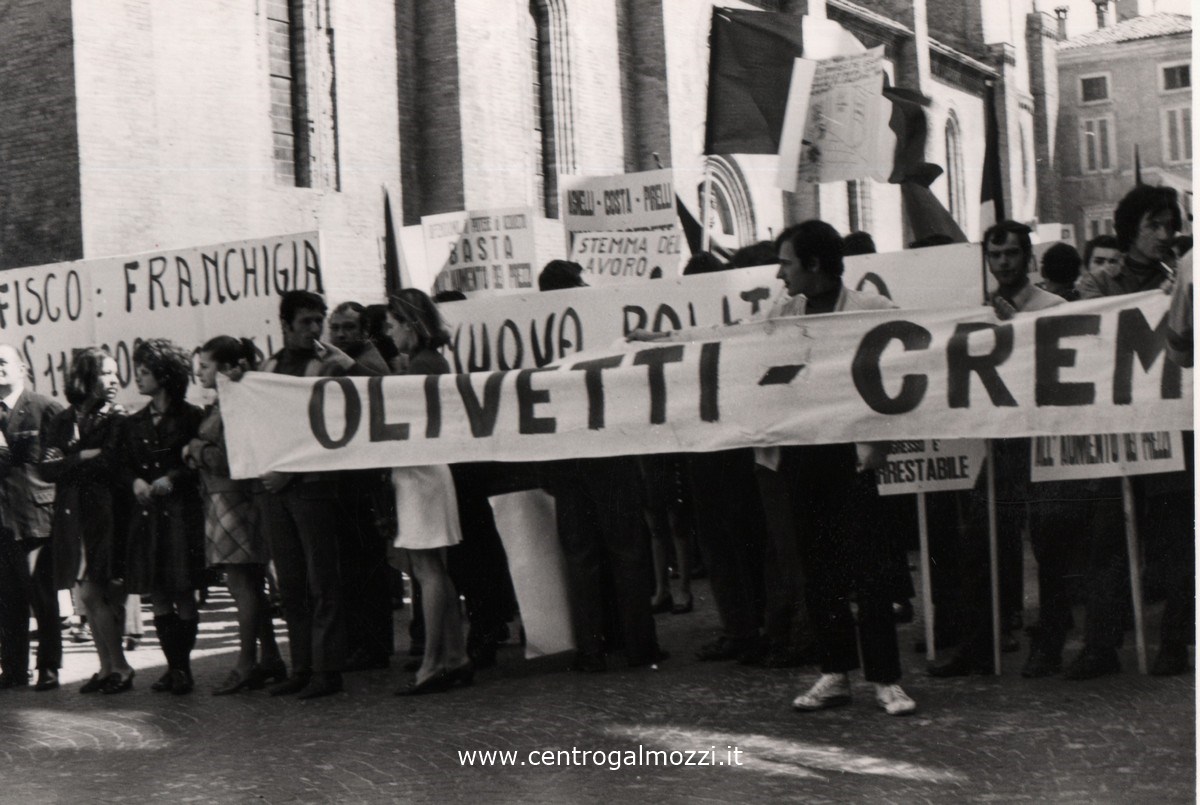 Manifestazione per il 1°Maggio in Piazza Duomo con striscioni e cartelli. In primo piano lo striscione dell'Olivetti di Crema