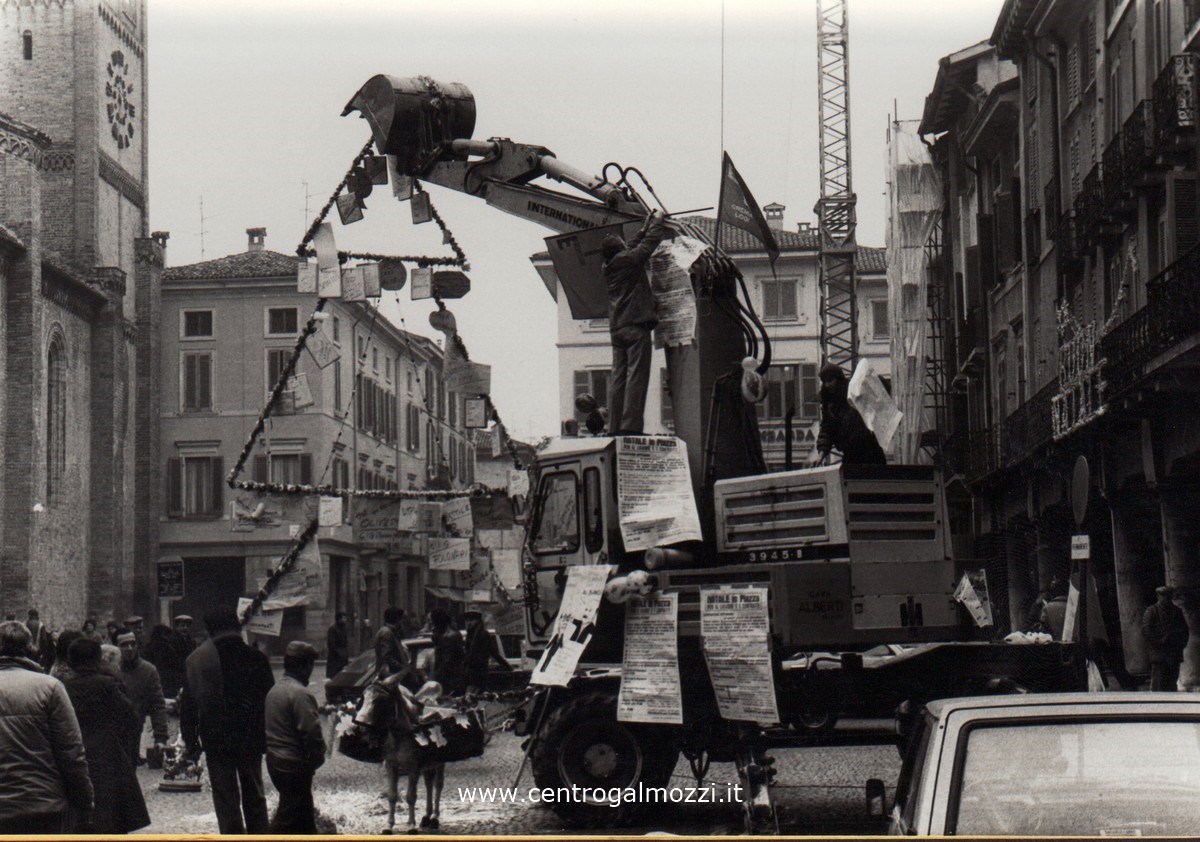 Operai sopra un bulldozzer in Piazza Duomo nel 1983